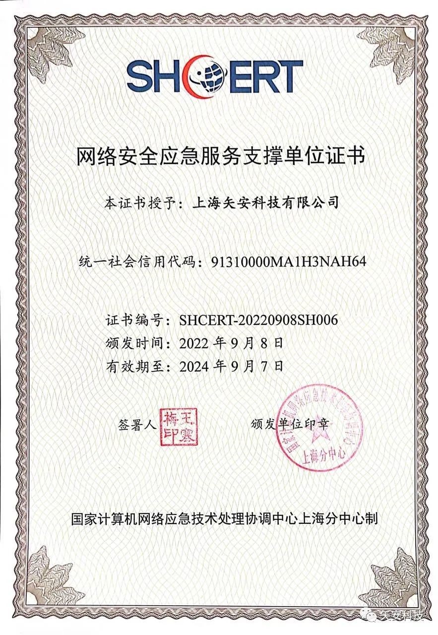 9月7日,2022年国家网络安全宣传周上海地区活动“共建数据安全治理体系 应对网络空间安全威胁”论坛在大宁会议中心召开,国家计算机网络应急技术处理协调中心上海分中心(SHCERT)为第五届SHCERT网络安全应急服务支撑单位授牌。矢安科技凭借全面的技术能力及核心竞争力,成功入选第五届“SHCERT网络安全应急服务支撑单位",未来将依托自身技术能力和优势,积极支持上海市网络安全工作。